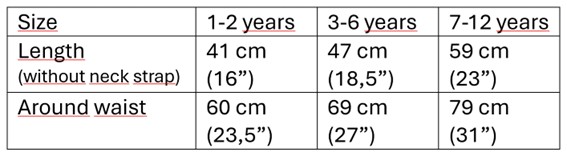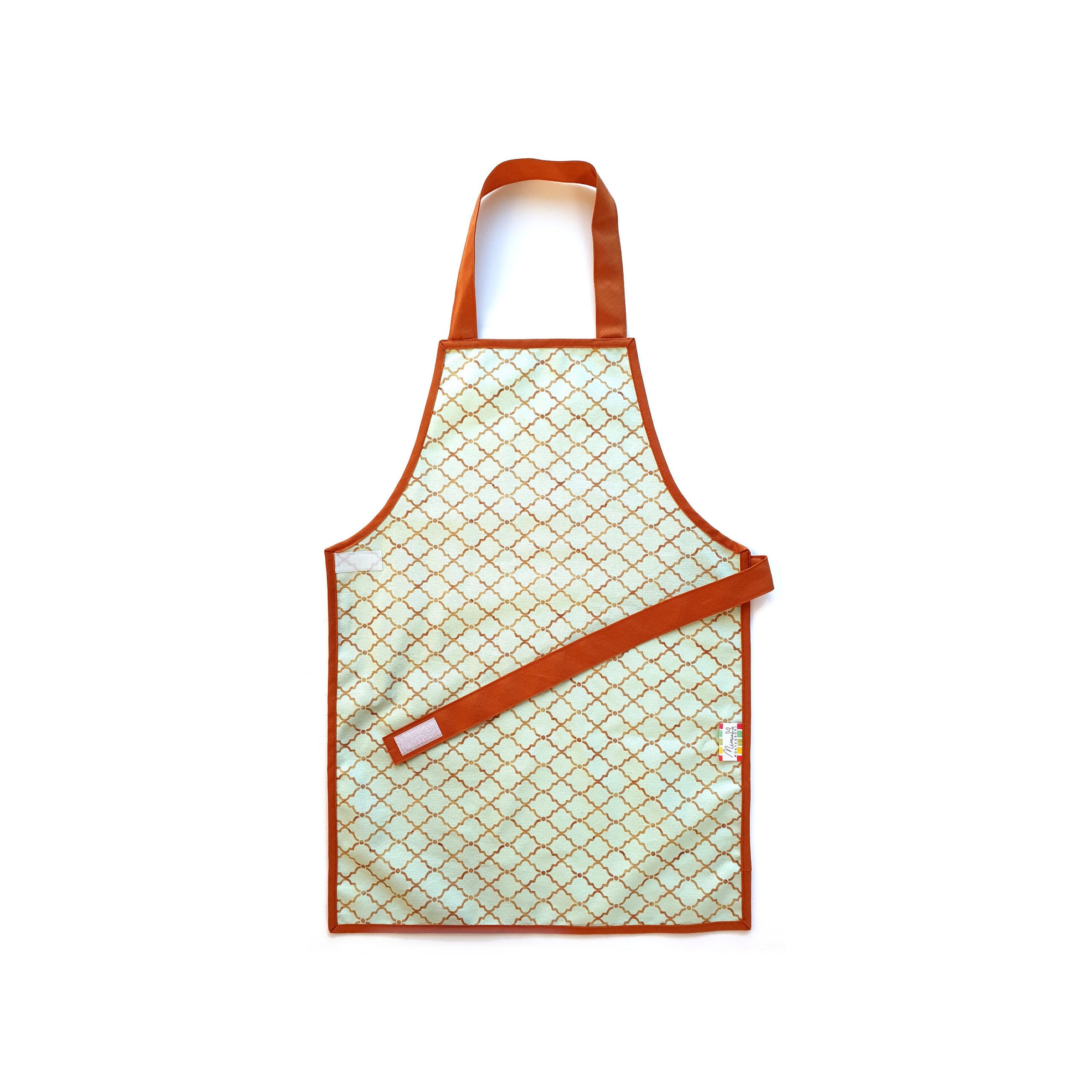 The apron is easy to put on, with an elastic neck strap (1–2 years and 3–6 years) and Velcro closure at the waist, easy for young children to manage. Since the child needs no help from an adult to put on or take off the apron, it fosters independence and contributes to self-confidence.