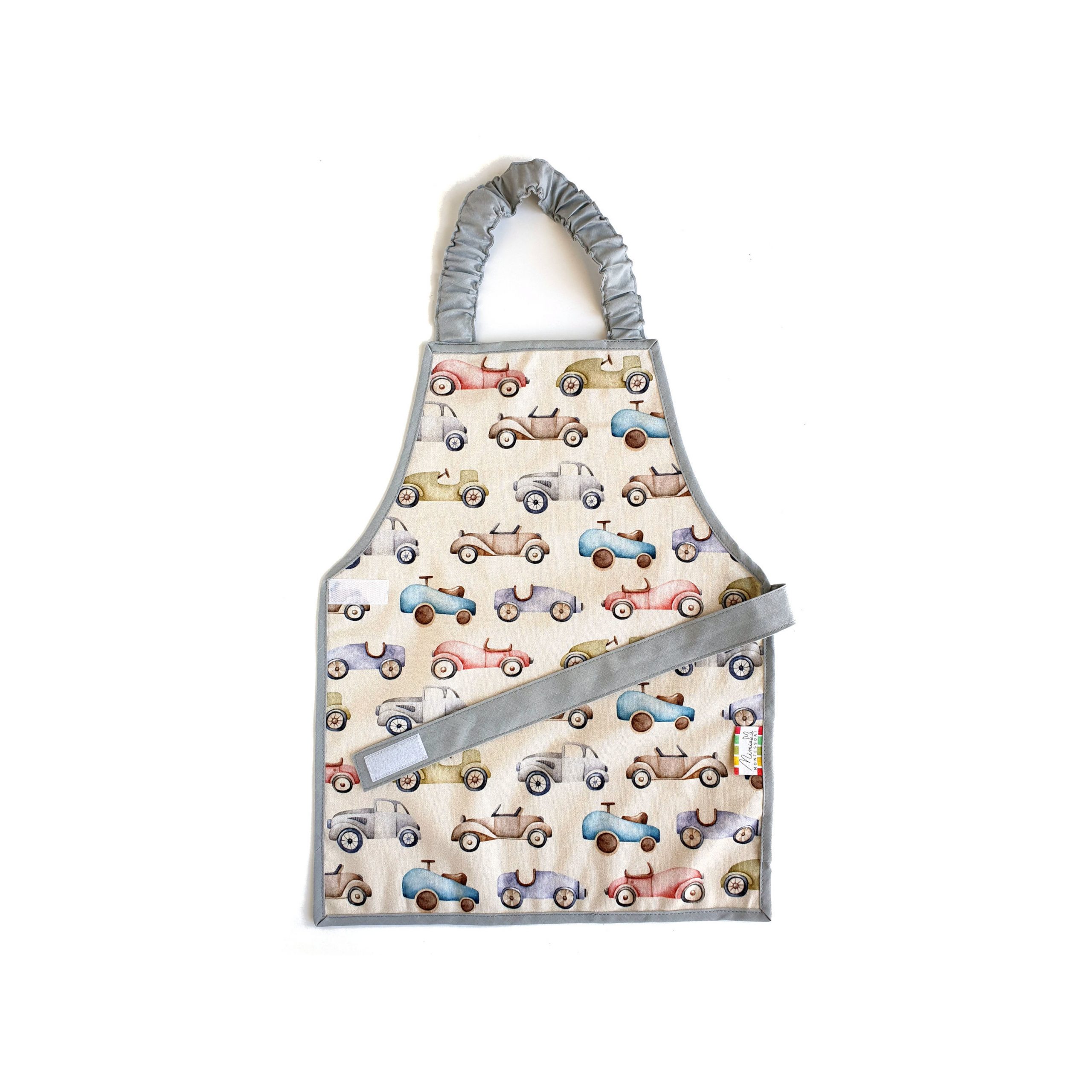 The apron is easy to put on, with an elastic neck strap (1–2 years and 3–6 years) and Velcro closure at the waist, easy for young children to manage. Since the child needs no help from an adult to put on or take off the apron, it fosters independence and contributes to self-confidence.